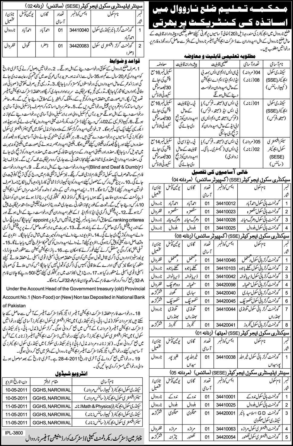 Education Department Narowal Career Opportunities For Males & Femalesof M.Sc, M.Ed, M.A, B.Sc, B.Ed in Maths, Physics, Chemistry, Botany and Zoology As Secondary School Educator SSE of Computer Science, Maths, Physics and Science. Send your resumes before 28-April-2011. Details are given below. Jobs in Daily Express.