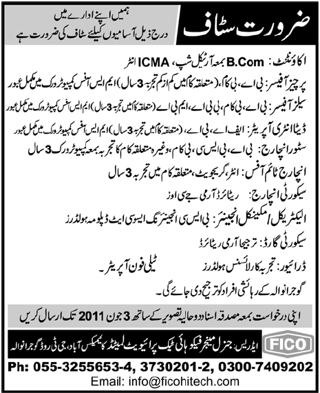 FICO Hightec Career Opportunities for ICMA Inter, Masters MBA, Bachelors B.Com, B.A, B.B.A, B.Sc Mechanical Engineering, DAE, Graduate, Intermediate and Retired Army Persons AS Accountant, Purchase Officer, Sales Officer, Data Entry Operator, Store Incharge, Incharge Time Office, Security Incharge, Electrical/ Mechanical Engineer, Security Guard, Driver and Telephone Operator. Send your resumes before 03-June-2011. Details are given below. Published in Daily Dawn.