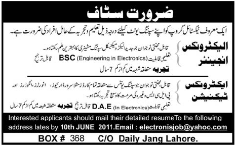 Textile Group Career Opportunities for B.Sc Engineering in Electronics and DAE In Electronics AS Electronics Engineer and Electronics Technician. Send your resumes before 10-June-2011. Details are given below. Daily Jang.