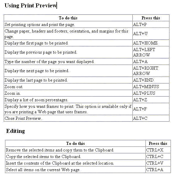 You can use shortcut Keys to view and explore Web pages, preview pages before printing, use the Address bar, work with favorites, and edit.