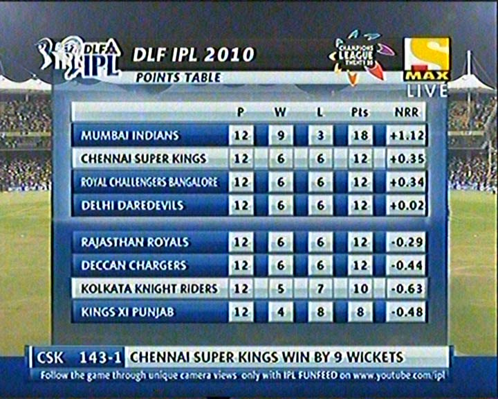 Re: *** Which Team is your favorite in IPL 2010 *** 1 Attachment(s) Chennai Super king did an awesome performance in their 12th match, before this they were at 7th position in series , now you can see they are at 2nd position,, Congrats Micro Soft Dhoni's Team... Attachment 15736 |