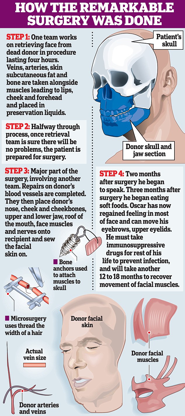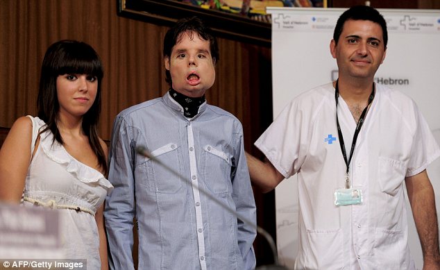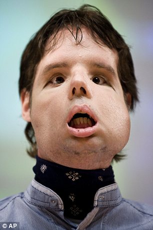 Facial Transplant... 6 Attachment(s) Face that doctors built: Gun accident victim shows off world's first full facial transplant By Tom Worden Last updated at 2:07 AM on 27th July 2010 Attachment 18256 Oscar, 31, underwent a full-face transplant in March. He appeared in public today for the first time at a news conference at the Vall d'Hebron Hospital in Barcelona, Spain Attachment 18257 Oscar (centre) with his sister and Dr Joan Barrett at the press conference. He can now eat a soft food diet and is learning to speak again Attachment 18258 Oscar stands beside Dr Joan Barret, left, and is surrounded by his doctors. He was treated by a team of 30 specialists Attachment 18259 Before the operation: Oscar lost his nose in a hunting accident Attachment 18260 Medical history: Dr Joan Pere Barret with X-rays showing the shattered face of the man prior to the operation Attachment 18261 |