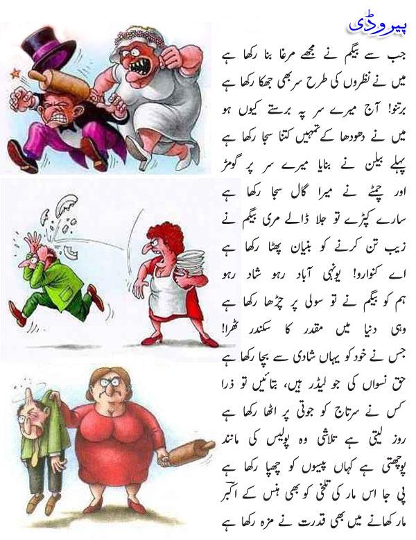 Jab se begum ne mujhe murgha bana rakha hai, Main ne nazron ki tarhan sir bhi jhuka rakha hai, Jab se begum ne mujhe murgha bana rakha hai, Main ne nazron ki tarhan sir bhi jhuka rakha hai, Bartano aaj mere sir pe baraste kion ho ? Mein ne dho dha k tumhain kitna saja rakha hai, Roz leti he talashi wo police ki manind, Pochti he kahan paison ko chupa rakha hai, Wahi duniya main muqaddar ka sikandar tehra, Jis ne khud ko yahan shadi se bacha rakha hai, Pi ja is maar ki talkhi ko bhi has k shohar, Mar khane mein bhi qudrat ne maza rakha hai.. |