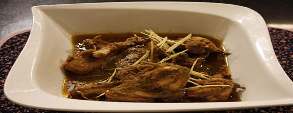 In a blender grind together 20 chopped green chilies, 2 cups yogurt, 1/2 bunch coriander leaves, 2 tbsp lemon juice, heat 3/4 cup oil in a pan, add 2 tbsp ginger garlic paste, fry for 2 minutes add 1 kg chicken and fry for another 5 minutes now add 1 packet of national chicken hara masala and the blended mixture, cook for 20 minutes on medium flame till chicken done, lastly add 2 tbsp sliced ginger and serve with nan. |