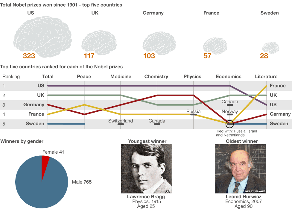 Nobel Prize Winner top 5 countries since 1901, Which country has the best brains 2 Attachment(s) Over the past week, the Nobel prizes have been awarded in chemistry, medicine, peace, physics and literature. The awards are an annual ritual celebrating human intellectual endeavour that began in 1901. They were set up by Alfred Nobel, a Swedish inventor and arms manufacturer, who requested in his will that his fortune be used to create a series of prizes for those who confer the "greatest benefit on mankind". Nobel winners in their own words Over the intervening 109 years, more than 500 prizes have been awarded. But which nation can claim the most winners? We have trawled throught the archives to produce a definitive list of the nations with the biggest brains. A clear winner would be the United States which comes out top overall, as well as in five of the six categories. The UK is next, with 117 Nobel medals. However, France, which bumps along in fourth or fifth, is clearly ahead when it comes to literature. But there are a total of 69 countries or territories whose citizens have picked up the prize, from St Lucia to this week's latest addition, Peru, birthplace of author Mario Vargas Llosa.