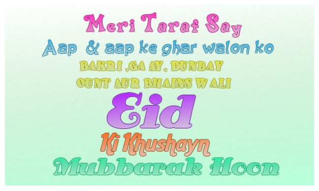 Eid Mubbarak bhai Sab Ko... 1 Attachment(s) :blowhorn:Attachment 297 :yippie::dance2::woo::padlock2::elefant::applause: :cheer_icoon::evil::caeked::nod::dancingbanana: Zara sa goshat Mujhay Bhi dena achha:stirpot: Hay Guys Wish the Eid Day Every One by Posting your replies to this thread... :smitten::sobstory::_abzw::2funny::rofl::(:bnana: |