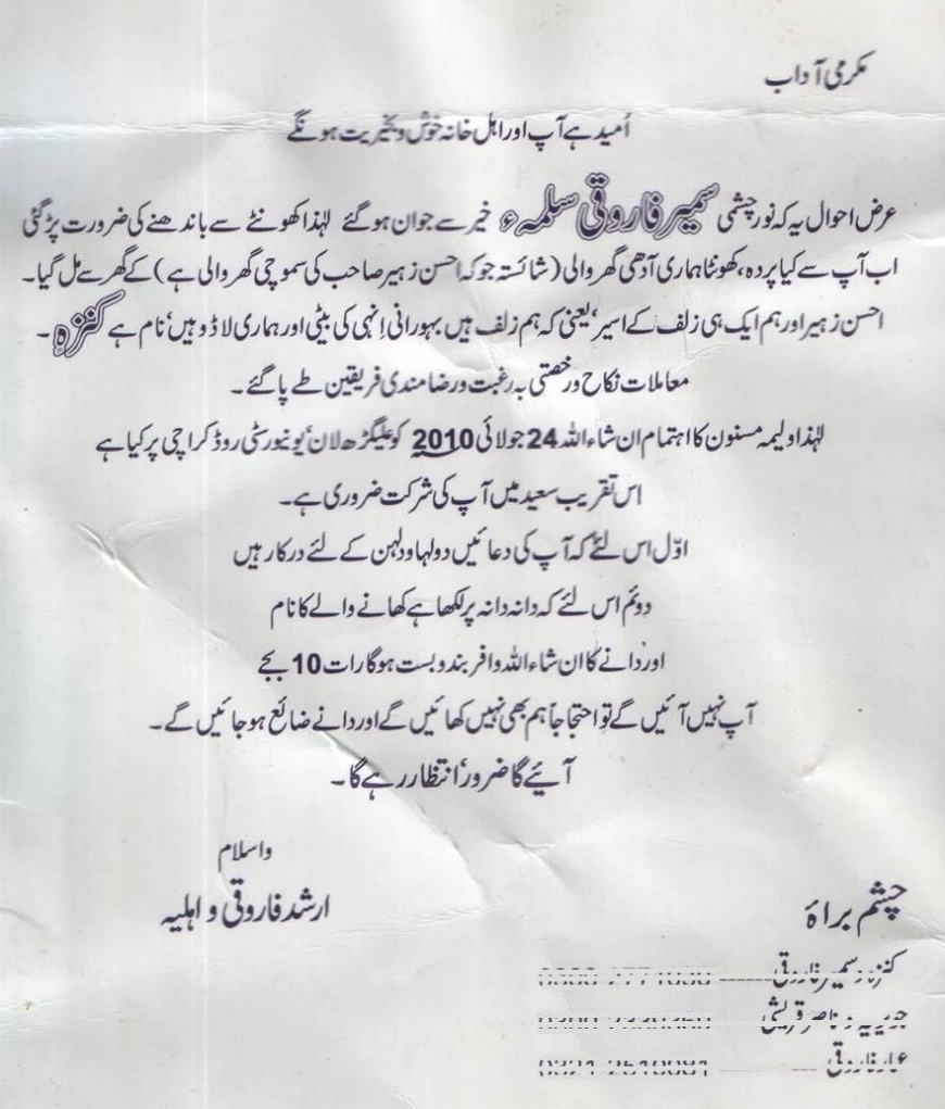 Re: An Urdu Wedding Card Worth Reading( Very Interesting ) sab theak hai but mobile numbers kiyun erase kiyay |