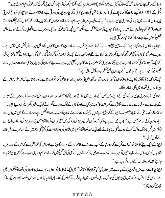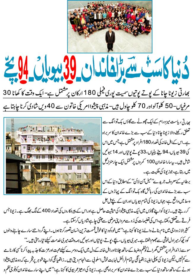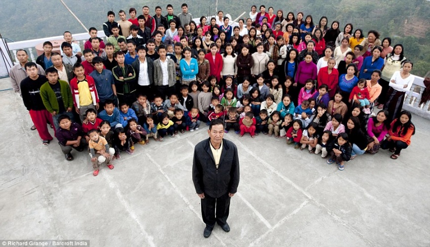 World's Biggest Family 5 Attachment(s) The world's biggest family: The man with 39 wives, 94 children and 33 grandchildren By Daily Mail Reporter Last updated at 9:39 PM on 19th February 2011 Ziona Chana lives with all of them in a 100-room mansionHis wives take it in turns to share his bedIt takes 30 whole chickens just to make dinner He is head of the world's biggest family - and says he is 'blessed' to have his 39 wives. Ziona Chana also has 94 children, 14-daughters-in-law and 33 grandchildren. They live in a 100-room, four storey house set amidst the hills of Baktwang village in the Indian state of Mizoram, where the wives sleep in giant communal dormitories. Attachment 22229 The full monty: The Ziona family in its entirety with all 181 members Attachment 22230 You treat this place like a hotel: With 100 rooms the Ziona mansion is the biggest concrete structure in the hilly village of Baktawng Mr Chana told the Sun: 'Today I feel like God's special child. He's given me so many people to look after. 'I consider myself a lucky man to be the husband of 39 women and head of the world's largest family.' The family is organised with almost military discipline, with the oldest wife Zathiangi organising her fellow partners to perform household chores such as cleaning, washing and preparing meals. One evening meal can see them pluck 30 chickens, peel 132lb of potatoes and boil up to 220lb of rice. Coincidentally, Mr Chana is also head of a sect that allows members to take as many wives as he wants. Attachment 22231 Feeling peckish? The senior ladies of the Chana family show what it takes just to make a meal Attachment 22232 The wives and I: Mr Ziona Chana poses with his 39 wives at their home in Baktawang, Mizoram, India He even married ten women in one year, when he was at his most prolific, and enjoys his own double bed while his wives have to make do with communal dormitories. He keeps the youngest women near to his bedroom with the older members of the family sleeping further away - and there is a rotation system for who visits Mr Chana's bedroom. Rinkmini, one of Mr Chana's wives who is 35 years old, said: 'We stay around him as he is the most important person in the house. He is the most handsome person in the village. She says Mr Chana noticed her on a morning walk in the village 18 years ago and wrote her a letter asking for her hand in marriage. Attachment 22233 Shared bedroom: A look inside the four-storey mansion, Chhuanthar Run - The House of the New Generation Another of his wives, Huntharnghanki, said the entire family gets along well. The family system is reportedly based on 'mutual love and respect' And Mr Chana, whose religious sect has 4,00 members, says he has not stopped looking for new wives. 'To expand my sect, I am willing to go even to the U.S. to marry,' he said. One of his sons insisted that Mr Chana, whose grandfather also had many wives, marries the poor women from the village so he can look after them. |