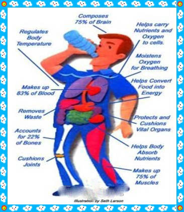 Water and its benifit 5 Attachment(s) World Water Day 22 March 2011 Attachment 22886 Benefits of Water The human body, which is made up of between 55 and 75 percent water (lean people have more water in their bodies because muscle holds more water than fat), is in need of constant water replenishment. Your lungs expel between two and four cups of water each day through normal breathing even more on a cold day. If your feet sweat, there goes another cup of water. If you make half a dozen trips to the bathroom during the day, that's six cups of water. If you perspire, you expel about two cups of water (which doesn't include exercise-induced perspiration). A person would have to lose 10 percent of her body weight in fluids to be considered dehydrated, but as little as two percent can affect athletic performance, cause tiredness and dull critical thinking abilities. Adequate water consumption can help lessen the chance of kidney stones, keep joints lubricated, prevent and lessen the severity of colds and flu and help prevent constipation. Health benefits of water Attachment 22887 Water is crucial to your health. It makes up, on average, 60 percent of your body weight. Every system in your body depends on water. Lack of water can lead to dehydration, a condition that occurs when you don't have enough water in your body to carry on normal functions. Even mild dehydration - as little as a 1 percent to 2 percent loss of your body weight - can sap your energy and make you tired. Dehydration poses a particular health risk for the very young and the very old. Signs and symptoms of dehydration include: Attachment 22888 * Excessive thirst * Fatigue * Headache * Dry mouth * Little or no urination * Muscle weakness * Dizziness * Lightheadedness How much water do you need? Every day you lose water through sweating - noticeable and unnoticeable - exhaling, urinating and bowel movements. For your body to function properly, you need to replace this water by consuming beverages and foods that contain water. So how much water, or more precisely fluid, do you need? This isn't an easy question to answer. A healthy adult's daily fluid intake can vary widely. Most people drink fluid to quench thirst, to supply perceived water needs and "out of habit." At least three approaches estimate total fluid (water) needs for healthy, sedentary adults living in a temperate climate. * Replacement approach. The average urine output for adults is 1.5 liters a day. You lose close to an additional liter of water a day through breathing, sweating and bowel movements. Food usually accounts for 20 percent of your fluid intake, so you if you consume 2 liters of water or other beverages a day (a little more than 8 cups), along with your normal diet, you can replace the lost fluids. * Eight 8-ounce glasses of water a day. Another approach to water intake is the "8 x 8 rule" - drink eight 8-ounce glasses of water a day (about 1.9 liters). The rule could also be stated, "drink eight 8-ounce glasses of fluid a day," as all fluids count toward the daily total. Though this approach isn't supported by scientific evidence, many people use this basic rule as a guideline for how much water and other fluids to drink. * Dietary recommendations. The Institute of Medicine recommends that men consume 3 liters (about 13 cups) of total beverages a day and women consume 2.2 liters (about 9 cups) of total beverages a day. These guidelines are based on national food surveys that assessed people's average fluid intakes.You can choose any of these fluid intake approaches to gauge your fluid needs. But your current total fluid intake is probably OK if you drink enough water to quench your thirst, produce a colorless or slightly yellow normal amount of urine, and feel well. Factors that influence water needs You may need to modify total fluid intake from these recommended amounts depending on several factors, including how active you are, the climate, your health status, and if you're pregnant or breast-feeding. * Exercise. If you exercise or engage in any activity that makes you sweat, you'll need to drink extra water to compensate for that fluid loss. Drink 2 cups of water two hours before a long endurance event, for example, a marathon or half-marathon. One to 2 cups of water is also adequate for shorter bouts of exercise. During the activity, replenish fluids at regular intervals, and continue drinking water or other fluids after you're finished. During intense exercise involving significant sweating, for example, during a marathon, sodium is lost in sweat, and you may need a sports drink with sodium rather than just water. Attachment 22889 * Environment. You need to drink additional water in hot or humid weather to help lower your body temperature and to replace what you lose through sweating. You may also need extra water in cold weather if you sweat while wearing insulated clothing. Heated, indoor air can cause your skin to lose moisture, increasing your daily fluid requirements. And altitudes greater than 2,500 meters (8,200 feet) also can affect how much water your body needs. Higher altitudes may trigger increased urination and more rapid breathing, which uses up more of your fluid reserves. * Illnesses or health conditions. Some signs and symptoms of illnesses, such as fever, vomiting and diarrhea, cause your body to lose extra fluids. To replace lost fluids, drink more water or oral rehydration solutions (Gatorade, Powerade, CeraLyte, others). When water loss can't be replaced orally, intravenous water and electrolytes may be necessary. Increased water intake is nearly always advised in people with urinary tract stones. On the other hand, you may need to limit the amount of water you drink if you have certain conditions that impair excretion of water - such as heart failure and some types of kidney, liver, adrenal and thyroid diseases. Attachment 22890 * Pregnant or breast-feeding. Women who are pregnant or breast-feeding need additional water 