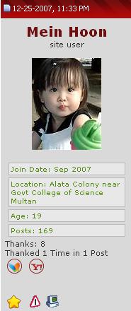 All New Addition in the site on Eid Day On Eid day I have completly edit the site and Upgrade the site ... Following upgradation has been done... Now The personal NotPad:coolgleamA: is available in your profile and now everyone can write there persoanl message there and save in that notepad for ever... Now you can create your own:argue: groups for your seperate communication.Its means If girl members not share there thought with boys they can create there own group and can make their Boys free comunication... I have creat on group now You can join it by clicking here In profile You can see the users notes and:blowhorn: comments about your self and everyone can post there comment for others.. In profile you can see the vistors names whom visit your profile it is new that was not before the Eid...huhuhh... like Orkut lolzzz Here now you can use the predefined Avatars available in the Edit Avatars Page there are more than 150 predefined avatars for serving my fellows.. The friend having no avatar the specific image Now you can upload your favorite Album for free on the site by using your control panel... Maximum sized image and max dimensions are allowed... |