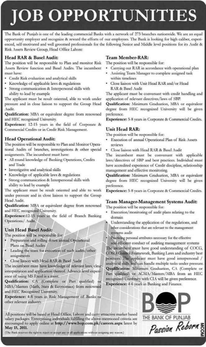 The Bank of Punjab Career Opportunities Pakistan 2011 1 Attachment(s) The Bank of Punjab Career Opportunities For Masters MBA, CA and ACMA AS Head RAR & Basel Audit, Head Operational Audit, Unit Head Basel Audit, Team Member RAR, Unit Head RAR and Team Manager -Management Systems Audit..Send your resumes at Jobs before 15-May-2011. Details are given below. Daily Dawn. For information visit: http://www.findpakistanjobs.com/bank...pakistan-2011/ Attachment 23626 |