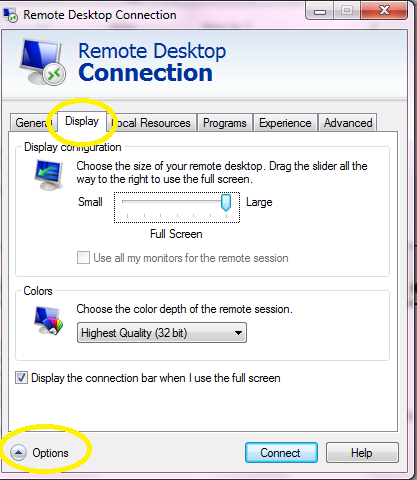 How to get Remote Desktop client in full screen mode 1 Attachment(s) Problem: This morning, I had a problem with the remote desktop client. The problem – I could not get the remote desktop client window to go in full screen mode. It would maximize to a window size smaller than my monitor. Solution: Hi, -Start "Remote Desktop Connection". -Click on "Options". -Click on the "Display" tab. -On "Display configuation" settings, you can change the "Remote Desktop Connection" display by moving the slider from "Small to Large". -By moving the "Slider" all the way to large, the display settings will automatically set to "Full Screen". Thanks Attachment 24750 |