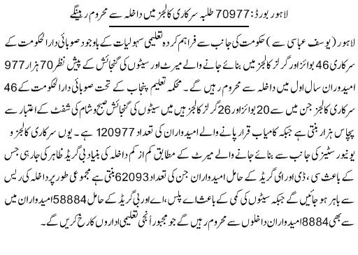70977 students not able to get admission in public colleges 1 Attachment(s) Board of Intermediate and Secondary Education Lahore (BISE Lahore) matric result 2011 on August 2, 2011. According to result 120977 students of Lahore city was declared pass in the matric exams 2011 and now they have to get admission in different colleges for further studies. The capacity of public colleges to admit students in Inter part 1 this year is 50,000. According to statistics more than 70 thousands students have to get admission in private colleges if all the pass students decided to get admission in inter part 1. There are 46 public colleges in Lahore comprising 20 boys and 26 girls’ colleges. According to the admission merit criteria the minimum grade for admission is B so the students having grades below B are not eligible for getting admission in any public colleges of Lahore. Here the point is that nearly 70977 students will have to get admission in private colleges and all can’t get admission in private colleges due to the high fees. Attachment 24965 |