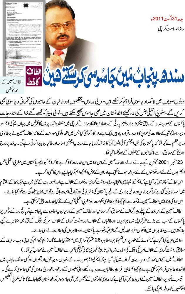 Sindh Punjab main Jasoosi kar skaty hain 1 Attachment(s) ٹونی بلیئر کے نام الطاف حسین کا خط۔ اب تو جاگو پاکستان، ورنہ کفارہ ادا کرنے کی مہلت بھی نہی ملنی Attachment 25382 |