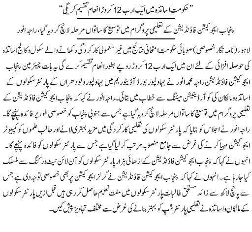 Punjab Govt. announced 1.12 billion for teachers 1 Attachment(s) Attachment 25745 Punjab government has announced 1.12 billion presents among those school/college teachers who have shown brilliant results in their academics. Chairman Punjab education foundation, Raja Muhammad Anwar has announced this decision in Bahawalpur coordination meeting of teachers. He said, seventh step of growth in educational program has been completed and southern Punjab areas will get special benefits from it. To improve education performance and facilitate students with computer education in partner schools, a brief plan has been prepared and it will be productive for partner schools, he said. 2500 partner schools have been communicated with online networking system and special consideration is also being given on girls’ schools. Approximately above 5 lakh female students are getting free education in these schools. |