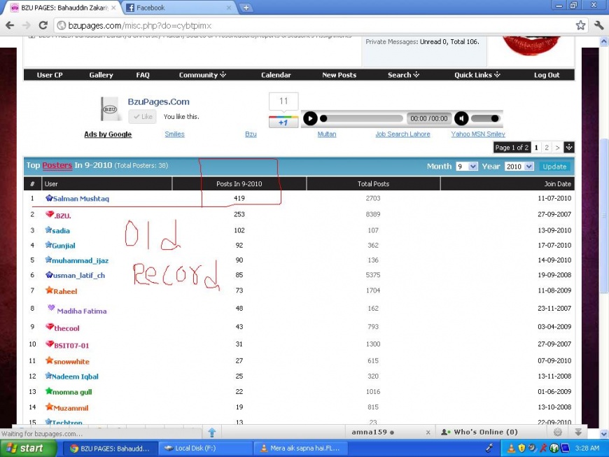 BZUPAGES Record 2 Attachment(s) :8_002:Asalam u alaikum ! 27 sep 2007 ko bzupags.com start hui ,,.,. Sep 2010 ko is website par 419 monthly post Salman Mushtaq nau kien jo record tha ,, let see Attachment 26183 lakin >BZU. nay Sep 2010 wala record tor kar Sep 2011 main 466 post kar k new record banaya hai ,, ab tak kisi nay one month main itna record nai banaya ... meri taraf say mubarak hu BZU g let see Attachment 26184 |