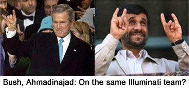 The pictures of Bush and Ahmadinejad giving the Satanic "goat's head" sign 1 Attachment(s) Illuminati defector Leo Zagami recently called Ahmaninejad a "well known Satanist with no real connection to Islam" and the Iraq-Iran-Israel conflict a "foreign intelligence show." ...... Empowered by the central banking cartel, the Illuminati Order has the resources to infiltrate both sides of every conflict, and steer it according to the New World Order agenda....... |