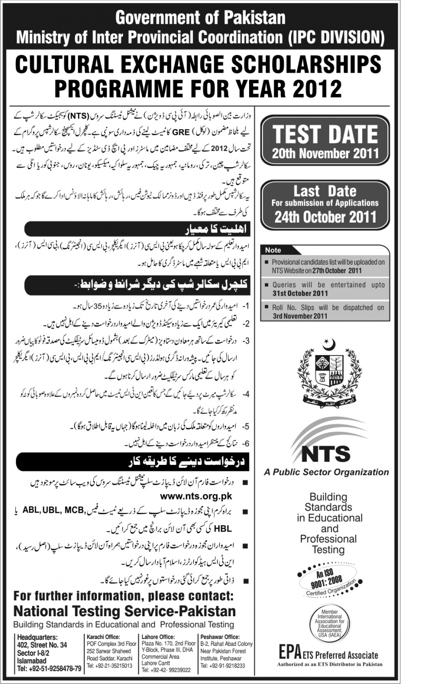 APPLICATION FORM: To download Application Form "Click Here" ADVERTISEMENTS: Attachment 26906 Attachment 26907 HOW TO APPLY: Candidates are required to send their applications on prescribed Application Form along with an online Deposit slip (in original) at the address given below. Please deposit online Rs. 800/- Online (Non-Refundable / Non-Transferable) through the prescribed deposit slip in the online branches of HBL, MCB, UBL or ABL. Application form and online deposit slip are available on NTS Website.>> Application submitted by hand will not be entertained. Please send your applications on the address given below :National Testing Service (NTS) Pakistan 402, Street No. 34, I-8/2, Islamabad Website: NTS Home UAN: 111 687 000 | ||||||||||||||||||||||||||||||||