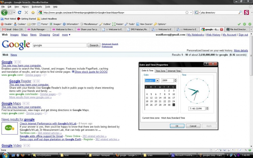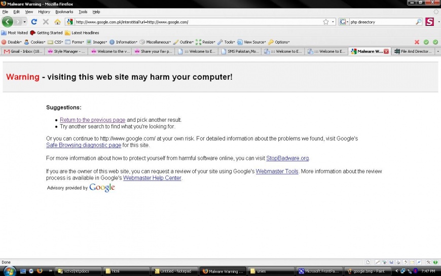 Google! What's Wrong with U ? :) 4 Attachment(s) Hello, First of all see these attached images... Attachment 3478 Attachment 3479 Attachment 3480 First 3 Screenshots were taken on Jan 31 2009 at 7:48 PM while I was searching through google... Whenever I tried to search, every link had this message ("This site may harm your computer")... I thought there may be some thing harmful in sites I am searching for... Then I searched the keyword "Google" ... It also came up with the same message ... And by opening the searched link... it showed another page and prevented to go to the site (even to Google.com).... I thought there may be problem with the com.pk domain of google... I searched in google.com it also showed me the same thing... ok... There was another strange thing when I tried to send a mail to my friend... Here is the screenshot... Attachment 3481 |
