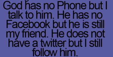 God have no phone but 1 Attachment(s) God have no phone but i talk to him He has no facebook but he is still my friend He does not have a twitter , But i still follow him Attachment 27924 |