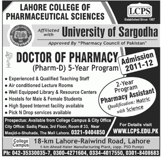 Admissions in Lahore College of Pharmaceutical Sciences 1 Attachment(s) Admissions in: Pharm-D Institute Name: Lahore College of Pharmaceutical Sciences Institute Phone and Address: 18-Km Lahore - Raiwind Road, Lahore. 042 - 35330035-7 Attachment 28191 |