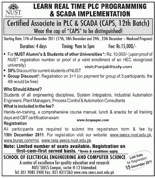 Admissions in NUST 1 Attachment(s) Admissions in: PLC & SCADA Institute Name: National University of Science and Technology Institute Phone and Address: Sector H-12, Islamabad. 051 - 90852400 Last Date of Application: 15-12-2011 Attachment 28195 |