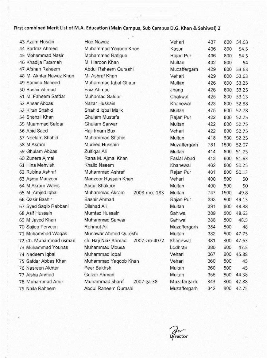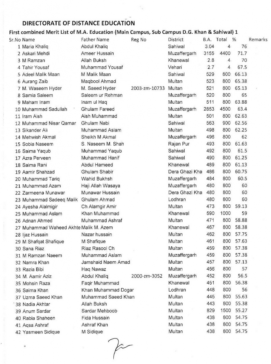 1st Merit List M.A Education (Main,D.G Khan & Sahiwal) Distance Learning Education 2012 2 Attachment(s) 1st Merit List M.A Education (Main,D.G Khan & Sahiwal) Distance Learning Education 2012. Attachment 28762 Attachment 28763 |