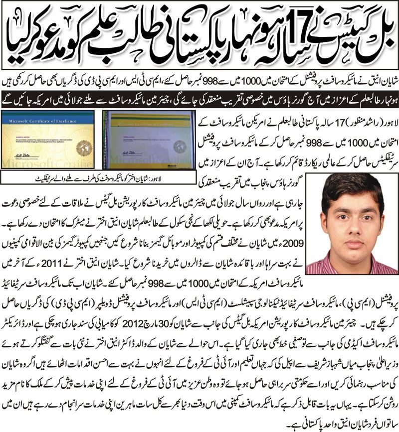 Re: Shyan Aneeq 17 year old talented student invited by Bill Gates Didn't understand the last bit : " Microsoft company mein is waqt dunyia bhar say kul 7 mahereen apni khidmat saranjam dy rhy hain in mein satwan fard shayaan aneeq wahid pakistani hy " This seems like another fraud like Ammar Afzal who claims himself. But now this story is closed in Media. Already exposed the reality. The Microsoft management in Pakistan and in US have denied any certification for this boy. |
