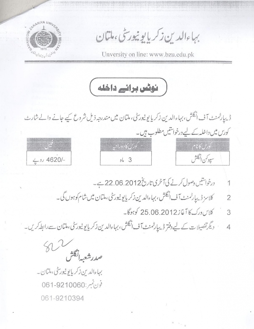 Spoken English Admission BZU 2012 (Date Extented)