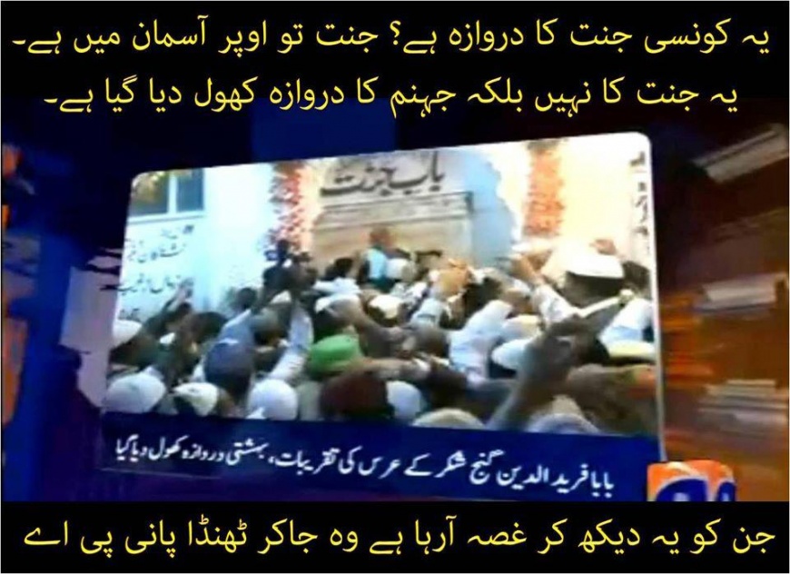 Babe Jannat, Bahishti Darwaza 2 Attachment(s) ذرا ٹھنڈے دل سے سوچیں ۔ افسوس کے ساتھ کہنا پڑتا ھے ۔ یہ کون سا جنت کا دروازہ ھے جو ہر سال کے بعد کھلتا ھے ۔ میرے رب کی حقیقی جنت کا دروازہ قیامت آنے کے بعد کھلے گا اور سب سے پہلے رسول اللہ صلی اللہ علیہ وسلم کے لئے کھولا جائے گا ۔اور رسول اللہ صلی اللہ علیہ وسلم سب سے پہلے داخل ہوں گے۔ Attachment 29432 اور با بے فرید کے دربار پے ہر سال جو دوازہ کھلتا ھے ۔ اس میں اللہ تعالی رسول اللہ صلی اللہ علیہ وسلم اور جنت کے دوازے کی توہین ھے ۔ اور یہ دوازہ جنت کا نہیں شرک اکبر کا دوازہ ھے ۔ جو اللہ تعالی نے جنت بنائی اس کے دوازہ پر جنتیوں کا سلام کے ساتھ اسقبال کیا جائے گا ۔ اور اس با بے کے دربار پے اس شرک کے دوازے پر پولیس ڈندوں سے استقبال کرتی ھے ۔اور کتنے لوگ زخمی اور مر جاتے ہیں ،، بھایئوں کچھ خدا خوف کرو ، آ جاؤ اس 1 اللہ کی طرف !! Attachment 29431 |