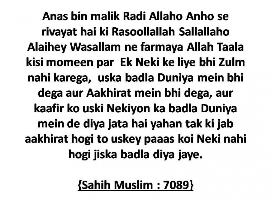 Momeen aur Kaafir ki Nekiyon ka Badla 1 Attachment(s) Bismillah irrahman nirrahim Attachment 29488 Hadith- Momeen aur Kaafir ki Nekiyon ka Badla ( Allaho Akbar) (English & Urdu Translation ) ------------------------------ English Translation: Anas b. Malik Radi Allaho Anho reported that Allah's Messenger (may peace be upon him) said: Verily, Allah does nut treat a believer unjustly in regard to his virtues. He would confer upon him (His blessing) in this world and would give him reward in the Hereafter. And as regards a non-believer. he would be made to taste the reward (of virtue in this world) what as has done for himself so much that when it would be the Hereafter. he would find no virtue for which he should be rewarded. { Sahih Muslim, Book 039, Number 6739 } Anas b. Malik Radi Allaho Anho reported that Allah's Messenger (may peace be upon him) thus told him: When a non-believer does good he is made to taste Its reward in this world. And so far as the believer is concerned, Allah stores (the reward) of his virtues for the Hereafter and provides him sustenance in accordance with his obedience to Him. { Sahih Muslim, Book 039, Number 6740 } ---------------------------- Urdu Translation: Anas bin malik Radi Allaho Anho se rivayat hai ki Rasoollallah Sallallaho Alaihey Wasallam ne farmaya Allah Taala kisi momeen par Ek Neki ke liye bhi Zulm nahi karega, uska badla Duniya mein bhi dega aur Aakhirat mein bhi dega, aur kaafir ko uski Nekiyon ka badla Duniya mein de diya jata hai yahan tak ki jab aakhirat hogi to uskey paaas koi Neki nahi hogi jiska badla diya jaye. {Sahih Muslim : 7089 } |