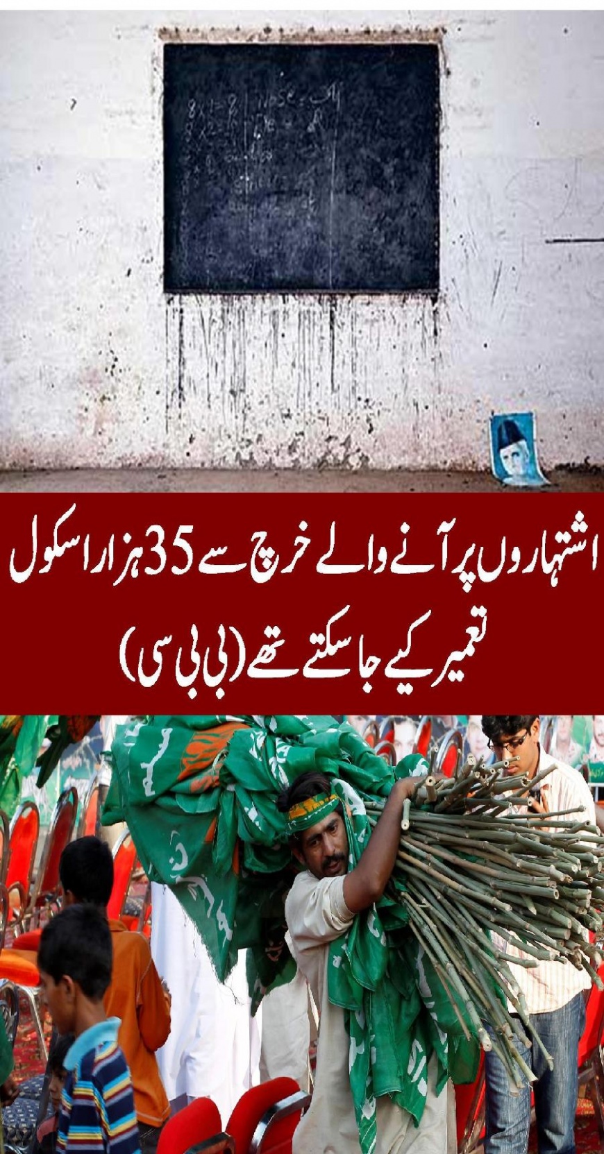 Election ke Ishtiharat ki bajaye Hazaron School banaye Ja sakte thay 2 Attachment(s) can develop thousands of school from the money of election ads اشتہاروں کی بجائے سکول بنا دیتے Attachment 29603 ‘تقریباً 50 بچوں کے لیے پرائمری سطح پر ایک چھوٹا سا سکول جس میں تمام بنیادی سہولتیں مثلاً بجلی، پانی، کھیل کا میدان، جھولے بچوں کا فرنیچر (سٹیل کا ضروری فرنیچر) اور اساتذہ کے لیے فرنیچر وغیرہ شامل ہیں۔ اسے قائم کرنے پر دو سے پانچ لاکھ روپے کا خرچ آتا ہے۔ پتا نہیں یہ ٹی وی پر اشتہار چلا کر کیوں سمجھتے ہیں کہ عوام تک ان کا پیغام پہنچ گیا ہے۔’ یہاں یہ یاد رہے کہ بچوں کے حقوق کے لیے کام کرنے والی ایک غیر سرکاری تنظیم سوسائٹی فار پروٹیکشن آف رائٹس آف دا چائلڈ (سپارک) کی 2012 میں جاری کی جانے والی سالانہ رپورٹ کے مطابق پاکستان سکول نہ جانے والے بچوں کی تعداد کے لحاظ سے دنیا کا دوسرا بڑا ملک ہے۔ Attachment 29604 |