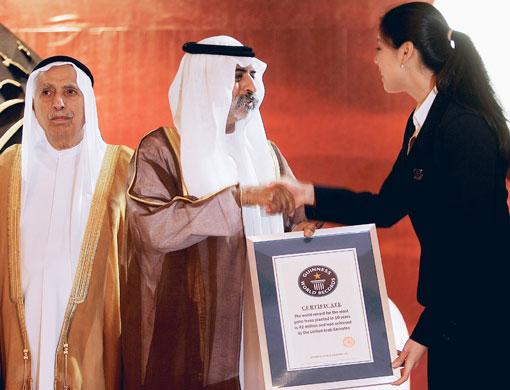 Record makers in dubai..... 4 Attachment(s) Sunday's world record is not the first involving dates. In September 2008, the certificate for the largest plate of dates in the world was awarded to Rakan Maktoum Al Qubaisi, Chairman of the Organising Committee of the Fourth Liwa Festival. Attachment 6589 haikh Nahyan Bin Mubarak Al Nahyan, Minister of Higher Education and Scientific Research, receives the Guinness World Records certificate for cultivating date palms from Jenny Karampoiki at the Emirates Palace Hotel in Abu Dhabi. Attachment 6590 The UAE has been officially recognised as the leading cultivator of date palms in the world with 42 million trees, it was announced on Sunday. To celebrate this honour, we look at other world records that have been broken in the country. Attachment 6591 Another record breaking feat for the capital came in February 2008, with the sale of the most expensive car plate in the world. License plate No. 1 was bought at auction for a staggering Dh52.2 million by Abu Dhabi businessman Saeed Al Khouri, breaking th Attachment 6592 |