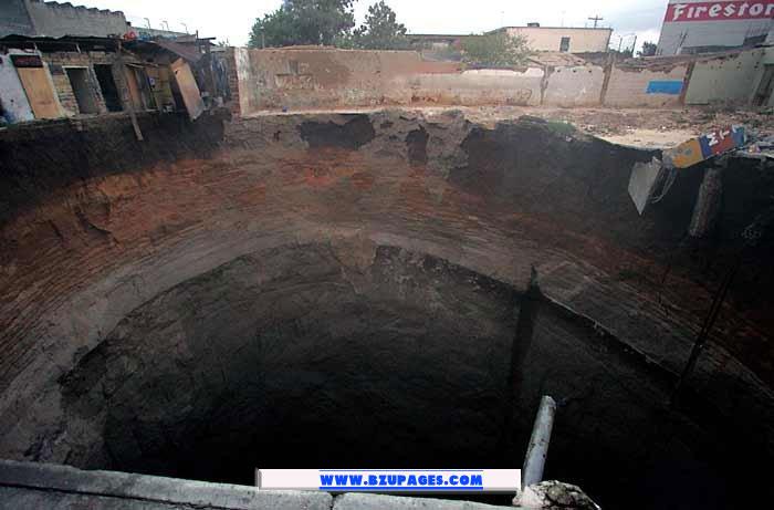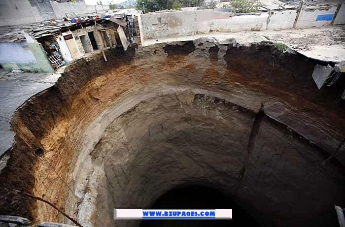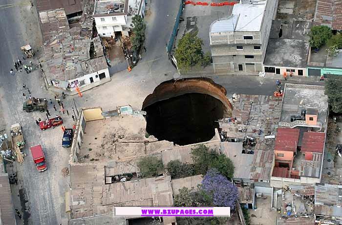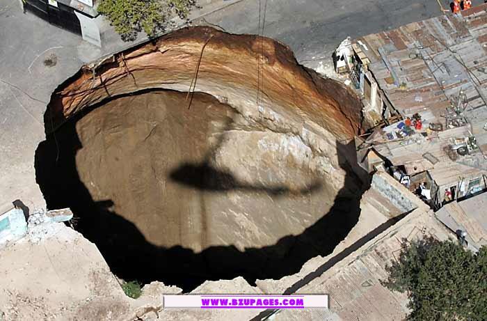Guatemala City : Sinkhole 5 Attachment(s) Guatemala City : Sinkhole A 330-foot-deep sinkhole Attachment 973 Attachment 974 Attachment 975 Attachment 976 Attachment 977 GUATEMALA CITY , Guatemala - killed at least two teenagers as it swallowed about a dozen homes early Friday and forced the evacuation of nearly 1,000 people in a crowded Guatemala City neighborhood. Officials blamed the sinkhole on recent rains and an underground sewage flow from a ruptured main. The pit emitted foul odors, loud noises and tremors, shaking the surrounding ground. A rush of water could be heard from its depths, and authorities feared it could widen or others could open up. Rescue operations were on hold until a firefighter, suspended from a cable, could take video and photos above the hole and officials could use the documentation to decide how to proceed. The dead were identified as Irma and David Soyos, emergency spokesman Juan Carlos Bolanos said. Their bodies were found near the sinkhole, floating in a river of sewage. Their father, Domingo, was still missing, according to disaster coordinator Hugo Hernandez. |