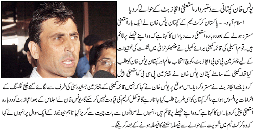 Younis for captaincy on his own terms 1 Attachment(s) Younis for captaincy on his own terms KARACHI: The resigned captain of Pakistan cricket team Younis Khan has said I will reaccept captaincy on my own conditions, Geo news reported Tuesday. This message was sent to Pakistan Cricket Board (PCB) through the Geo news program ‘Aaj Kamran Khan Kay Saath’. I underwent through tough situations during seven to eight month of captaincy and it is not an easy job to appear before any kind of committee, sources said. Younis said the entire team is playing like one unit today and he had no complaints against nation. “Now, PCB chairman Ejaz Butt has to decide – the ball is in his court that if he keeps me captain or otherwise”, he concluded. |