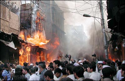 91 killed in Peshawar market blast: officials 2 Attachment(s) Attachment 10627 PESHAWAR : A powerful bomb blast ripped through the congested Meena Bazaar close to Piple Mandi in the heart of Peshawar city here Wednesday killing at least 91 people and injured around 215, local hospital sources told reporter at the hospital. The spokesman of Lady Reading Hospital told APP that up to 91 people were killed and around 215 injured in the deadly blast. He said that emergency has been imposed in hospital and doctors on leave have been called in for duty. The critical injured have been shifted to ICU, he added. He appealed for blood donation. The AIG Bomb Disposal Squad Shafqat Malik told media that huge explosion occurred due to car bomb in which around 150 kilogram explosive material was planted which played havoc in the thickly populated Meena bazaar and Pipal Mandi. Several buildings at the site of explosion were razed to ground as result of which most of the people were trapped under the debris and died due to burn injuries and suffocation. The DCO Peshawar Shahibzada Muhammad Anis said that most of the dead are women and children. Over five dozens shops were gutted and vehicles smashed into pieces. The blast site was situated close to Chowk Yadgar and Ghanta Ghar, commercial hub of the provincial capital. The local rescuers evacuated the people from the debris and shifted them to the hospital. Huge fire erupted after the blast was extinguished by the city fire brigade. The death toll may rise with the passage of time after clearing rubbles of the destroyed buildings, DCO told the media men. The Rescue teams are facing the problems in evacuating the injured from the site as the area is thickly populated. Attachment 10628 پشاور دھماکا،91افراد جاں بحق پشاور: پشاور کے علاقے پیپل منڈی میں زور دار دھماکے سے متعدد خواتین سمیت اکیانوے افراد جاں بحق اور دو سو کے قریب زخمی ہوگئے۔پچیس زخمیوں کی حالت نازک ہے۔ہلاکتوں میں اضافے کا خدشہ ہے۔ دھماکا اندرون شہر کے گنجان آباد علاقے پیپل منڈی کے قریب مینا بازار میں ہوا۔ دھماکا اس قدر شدید تھا کی دکانوں، مکانات اور گاڑیوں میں آگ لگ گئی اور علاقہ شعلوں کی لپیٹ میں آگیا۔ دھماکے سے قریبی مسجد شہید ہوگئی اور پچاس سے زائد دکانوں اور گاڑیوں کو نقصان پہنچا۔ متعدد زخمی تاحال مسجد کے ملبے تلے دبے ہیں۔ دھماکے کے وقت مینا بازار میں رش تھا اور خواتین بچوں کے ساتھ شاپنگ میں مصروف تھیں۔ دھماکے کے بعد بازار میں بھگدڑ مچ گئی۔ ہر طرف زخمیوں کی امداد کیلئے چیخ و پکار تھی۔ ایک ایک ایمبولنس میں کئی کئی زخمی اسپتال منتقل کئے گئے۔ لوگ زخمیوں کو دیکھ کر آہ و بکا کررہے تھے اور کچھ بازار میں پیاروں کو تلاش کررہے تھے۔ زخمیوں میں جمعیت علما اسلام کے صوبائی سیکرٹری اطلاعات کی اہلیہ اور بچے بھی شامل ہیں۔ اسپتالوں میں ایمرجنسی نافذہے۔ لیڈی ریڈنگ اسپتال کی انتظامیہ نے اکیانوے ہلاکتوں کی تصدیق کرتے ہوئے لوگوں سے خون دینے کی اپیل کی ہے۔ اڑسٹھ لاشیں ناقابل شناخت ہیں۔ حکام کے مطابق دھماکے میں ایک سو بیس کلوگرام دھماکا خیز مواد استعمال کیا گیا۔ وزیراعلی سرحد نے دھماکے کی تحقیقات کا حکم دے دیا اور اندرون شہر سیکورٹی سخت کرنے کی ہدایت کی۔ پشاور کے داخلی اور خارجی راستوں کی ناکہ بندی کردی گئی ہے۔ سینئر ڈی سی او کے مطابق یہ تیرہواں دھماکا ہے جس میں کئی افراد جاں بحق ہوئے۔ اس مہینے اب تک پشاور میں دہشت گردی کی چار بڑی وارداتیں ہو چکی ہیں۔ صدر اور وزیراعظم نے دھماکے کی مذمت کی ہے۔ |