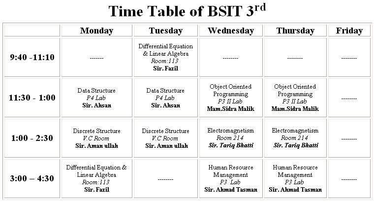 Re: Time Table of BSIT 3rd 1 Attachment(s) Yeh Time Table Hamesha Change kiyon hota Rehta hay... Is Semester main tu Bohut change hoya hay... Finally yeh change ho kar kuch iss trah say ho gia hay... I think kay abh change nahi ho ga. that is why I like to share it here... Have a nice night...:happydance: |