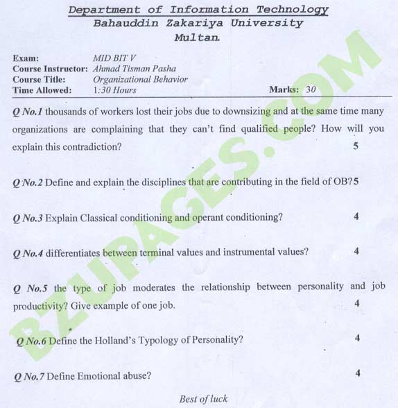 Mid term paper Organization Bahviour ; Sir Ahmad Tisman BSIT07 5th semester; 29 Octobere 2009 1 Attachment(s) |