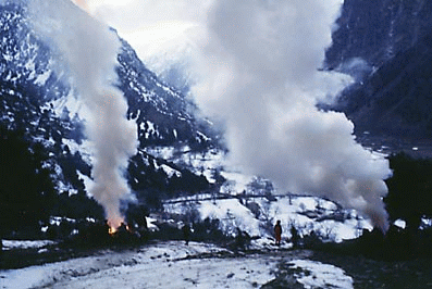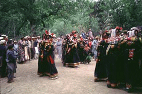 Kalash Valley: Where Fairies Dance and Sing; Kafir Kalash (The Wearers of Black Robe) 22 Attachment(s) Obscured by high mountains and treacherous muddy tracks, there live a people up in the north of Pakistan, who do not even know who they are or from where they came to live a life of isolation - yet maintain and protect their beliefs, their ideology and way of living. Their ancestry is enveloped in mystery and has always remained a subject of controversy. A legend says that five soldiers of the legions of Alexander of Macedonia settled in Chitral and are the progenitors of the Kafir-Kalash. One can still find similarities between the sports and games (specially the wrestling and shot-put style with those practiced in the ancient Olympics. Their features are not local and are thought to resemble those of the South-European characteristics. Some even find their influence of Greek music in Kalash music. Alexander the Great when encountered Kalash, he is said to have remarked that he encountered strange wooden boxes, which his troops chopped up to be used as firewood. These "boxes" were actually coffins for their dead following the custom which the Kalash Kafirs of Chitral still have of leaving their dead outside in wooden coffins. He also described them as a light skinned race of European type people, which is exactly what they are. Kalash ruled over the areas now part of the Chitral Valley and neighbouring Afghanistan for three centuries (1200-1400AD). Remnants and ruins of Kalash forts can still be seen Uchusht and Asheret . The famous bridge over Chitral River known as Chee Bridge was also built by a Kalash ruler. The names of Bala Sing, Razhawai and Nagar Shao are still alive in the folklore of Chitral. They were the most prominent among the eight Kalash Kings. Between the town of Drosh and Chitral city, a track turn to the left from village of Ayun on Kunar river to the Kalash Valley, where these strange yet attractive people live in three villages of Rukmu, Mumret and Biriu (called Rambur, Bumburet and Birir in local Kalashi language), south of Chitral. Bumburet (above right), the largest and the most picturesque valley of the Kafirs, is 40 kilometres from Chitral and is connected by a jeepable road. Birir and Rambur are located at a distance of 34 and 32 kilometres respectively from Chitral. The present population of the Kafir Kalash is approximately 3,000. However, after living in obscurity for long, their children are now studying in local schools, but do not move out to seek other avenues of livelihood and continue to cling to their age old traditions and customs. The villages are situated on the southern face of the hillside about 50-100 meters above the river. This protects them from invaders and the floods in summer, and at the same time helps to get sunshine during the winter. The snow that lies on the bottom of the ravine and in the shade do not melt until spring. In summer to avoid the sun, some people live in a second house built on the opposite side of the river. The Kalash Valleys have extensive forests of Holly-Oak and Himalayan cedar. Walnut, Apricot, Apple, Pear and Mulberry trees abound near the villages. The Kalash women wear five large braids of and the 'Cheo', a black woolen homespun dress, red-beaded necklaces by the dozen, and an exceptional head piece (shaped differently in each valley) covered in cowrie shells, beads and trinkets that flow down their back. For their black robes, the Kalash are sometimes referred to as the "Wearers of the Black Robes". Kalash means black in their language. Attachment 10730 Rudyard Kipling's "The Man Who Would Be King" is purported to be in the Kafir Kalash Valleys. In the late 19th century the present day Kalash Valley was known as Kafiristan -- Land of the Infidels -- and extended to several valleys in present day Afghanistan. However, the inhabitants of the Afghan Kafir valleys were forcibly converted to Islam, leaving only the tribes of the three valleys of Rambur Bumburet and Birir to carry on their centuries-old animistic culture. In order to conserve this primitive pagan tribe and to protect their distinctive identity, unparalleled in the world, the Government of Pakistan has officially forbidden anybody from trying to convert these tribes to another religion. The Kalash tribes have their own distinctive religious and social traditions. The Kalash believe in God they call “Deziao”. However their religious practices are a mixture of animism and ancestor worship. Their god is represented in wooden effigy, while animal effigies represent their belief in animism. There is also a concept of male and female sacred spirits called “Dewalok” who are responsible for different activities and are believed to communicate prayers to Deziao. There is also a concept of pure-impure dualism in Kalash religion. The pure is called ‘Onjesta’- the pure – while women are considered Pragata- the impure. They leave their dead open in the coffins, even when the bodies have become mere skeletons (below left). They usually leave all of the belongings of that person next to their coffins. At nightfall, animals and other beasts of pray come down the mountains and eat up what remains of that dead while the belongings are carried away by other inhabitants in the area. The Kafirs end up believing that the deceased has gone along with his belongings. The Kalash graveyards are smelly for the obvious reason and the faint hearted should not go as they should expect to see unsuitable scenes. Attachment 10738Attachment 10740 Kalash women adorned with make-up and their necks laden with bright orange and yellow necklaces, wear brightly coloured embroidered robes, which go very well with their rather fair colour and generally blue eyes. The women in Kalash are expected to treasure traditional knowledge. Yet when it comes to sitting around for a lunch or dinner, like many other agrarian communities, they are suppose to take a back seat, eat less and o