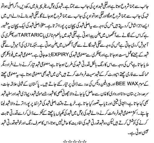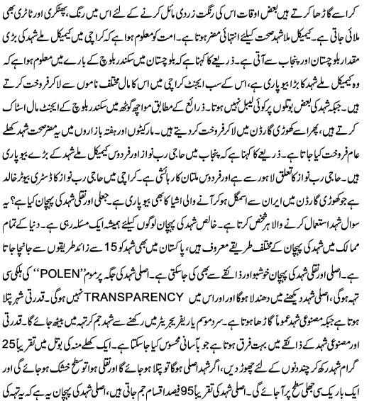 Re: Harmful Honey ; Chemical Mila Shehid Sihat barbaad kerta hay good and informative article. Yeh loog tu guaranty dete hain kay hum original honey provide kertay hain... even kay un kay honey jar kay bottom per cheeni ki trah ka kuch mojood hota hay... business main her traf dhoka diya jata hay.. :( |