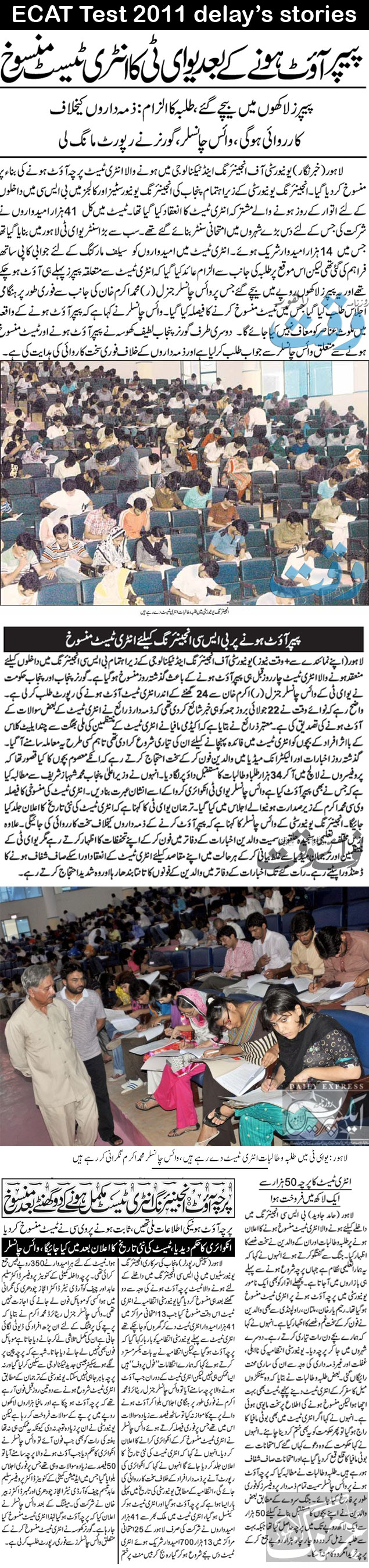 lahore main 13000 bachoun nay test diya .,.,.,., yey paper out ka kaam 3,00000 say start hua aur 30,000 tak a gaya tha ,.,. kuch friendss nay 3000 or 4000 add kar k paper kharida ,,.,.,. in k sath yahi hona chayey tha but afsoos ki baat yey hai k baqi cities main test out nahi hua tha aur un ko bhi saza mil gai .,., kisi ka test tou buhat buhat acha hua tha ,.,., ab new date 11 september 2011 bata rahe hain university walw main ne phone kiya tha phelay tou utha nahe rahe thay phir bata nahi rahe thay par app k bhai nay ugalwa liya