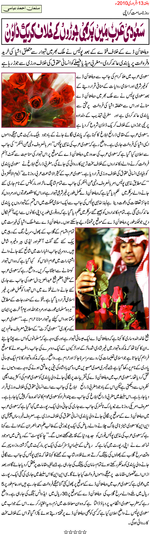 تاجدار مدینہ کے امتیوں نے کبھی حیا کا دامن ہاتھ سے نہ چھوڑا۔مگر اب لگتا ہے کہ امتی حیا کے اس بھاری بوجھ کو زیادہ دیر تک اٹھانے کے لیے تیار نہیں۔اب وہ حیا نہیں کریں گے بلکہ جو ان کا دل چاہے گاوہی کریں گے۔ ویلنٹائن ڈے کسی دوسرے تہوار کا نام نہیں۔ مسلمانوں کے لیے یہ وہ تہوار ہے جب امتی اپنے آقا کو بتاتے ہیں کہ ہم وہ کریں گے جو ہمارا دل چاہے گا۔