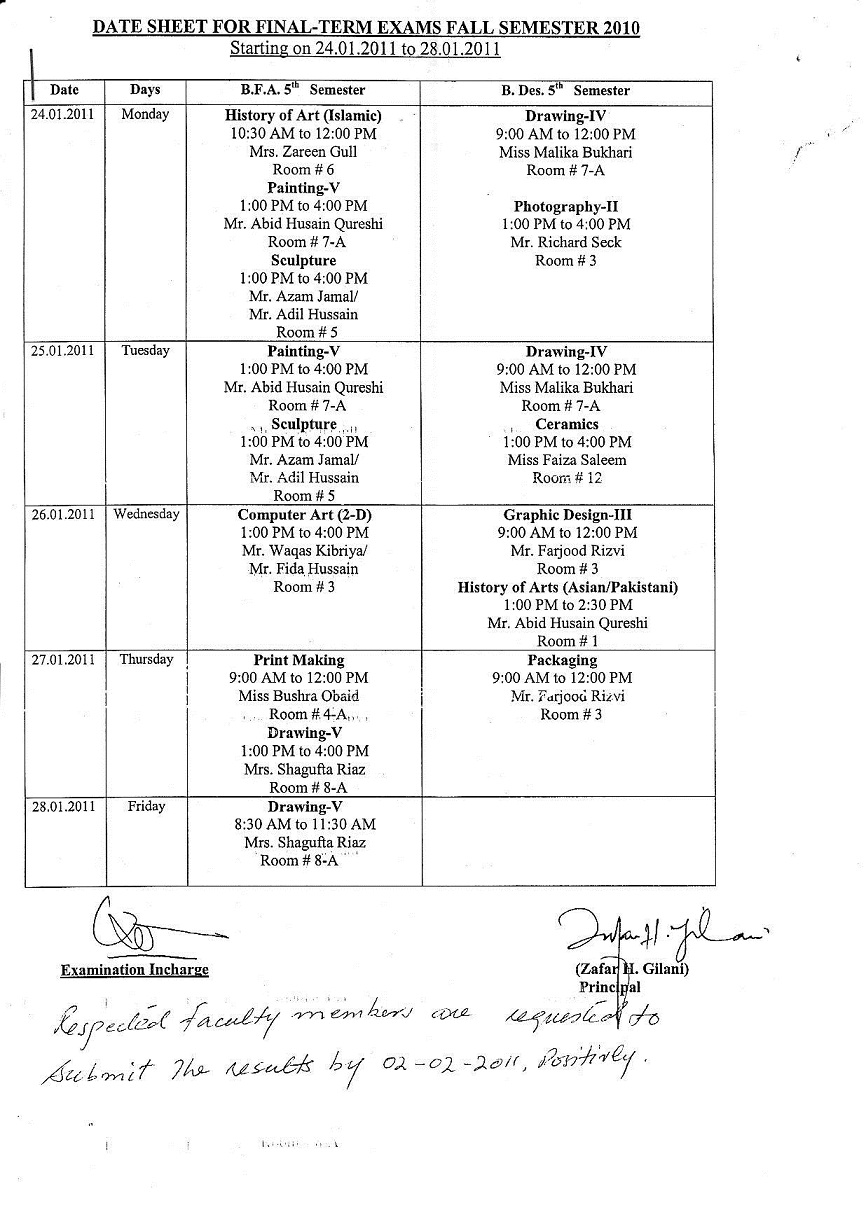 Date Sheet for Final term Exams January 2011 Multan College of Arts
