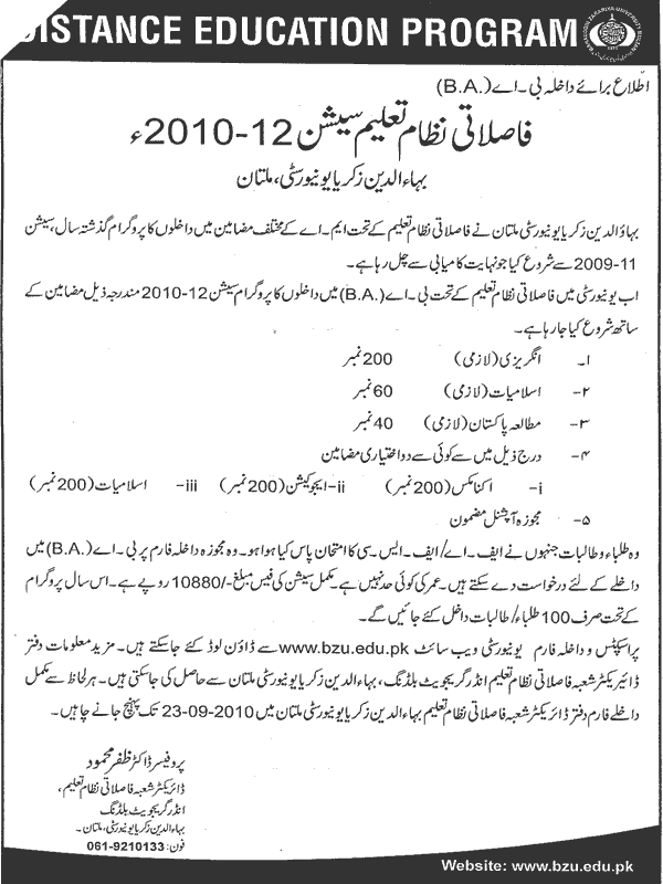Admissions Open B.A Through Distance Education 2010-2012