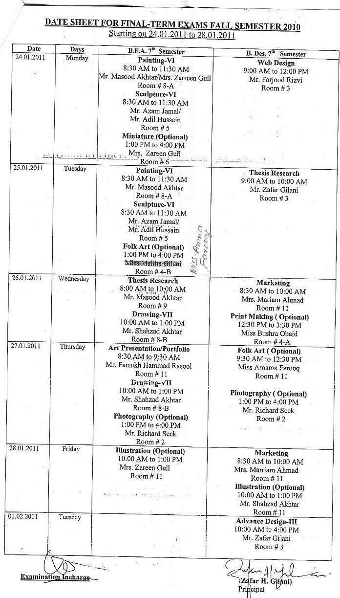 Date Sheet for Final term Exams January 2011 Multan College of Arts