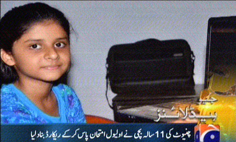 11 years girl sets world record in O-Level 1 Attachment(s) 11 years girl sets world record in O-Level Attachment 28436 Brilliant young girl Sitara Akbar, who is only 11 years old and a resident of Chiniot, set a world record by passing O-level English, Mathmatics and Science, Geo News reported on Sunday. This is not the first time that the eleven-year-old girl from Chanab area of Chiniot had dazzled the world with her brilliance. She had passed O-level Chemistry in nine years of age, hitting a record in Pakistan. Sitara then went ahead and succeeded in setting her first world record after passing O-level Biology at the age of 10. Sitara Akbar recently pushed the bar up for the world by hitting a new record by passing English, Mathematics, Physics, Chemistry and Biology in O-level. She obtained 7 out of 9 bands in International English Language Test System (IELTS) which is a requirement to get admission for post-graduate education in many colleges abroad. Sitara's father lamented that she had once been expelled from an elementary school on grounds that she asked many questions in the class. |